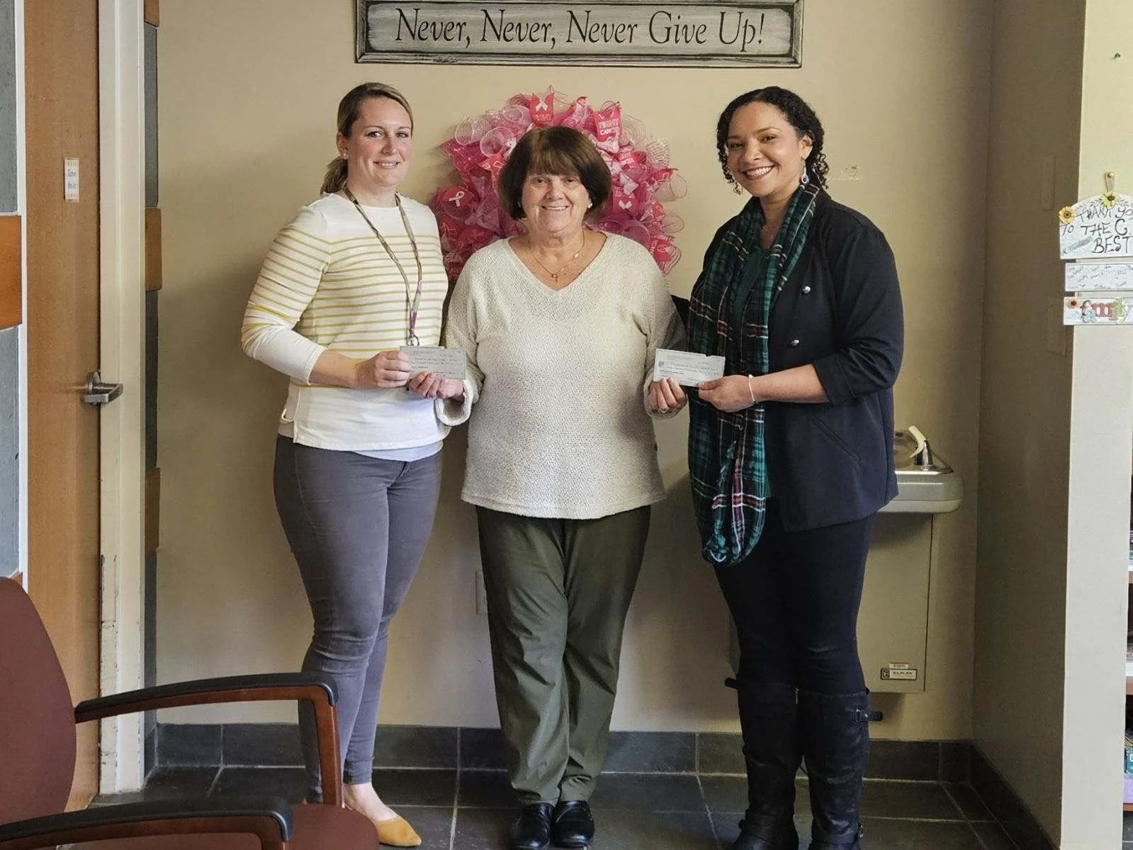 Board member Barb Spadaccini presenting checks to Compassionate Care Foundation and the Richard E. Winter Cancer Center on behalf of the St. Lawrence County Cancer Fund